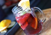 Освежающий напиток - сангрия из красного вина с апельсиновым соком, ликером Куантро, коньяком, корицей и спрайтом.