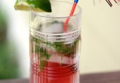 Коктейль из клубничного пюре с лаймом, листьями мяты, сиропом, ромом и содовой.