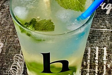 Коктейль из сиропа с лимонным сорго, листьев мяты, сока лайма и светлого рома с содовой.