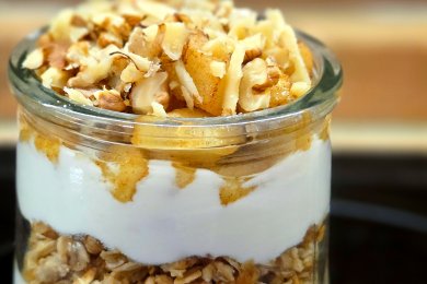 Хрустящие теплые яблоки “танцуют” в ванильном йогурте. Изумительный, легко приготавливаемый яблочный парфе в стекле.