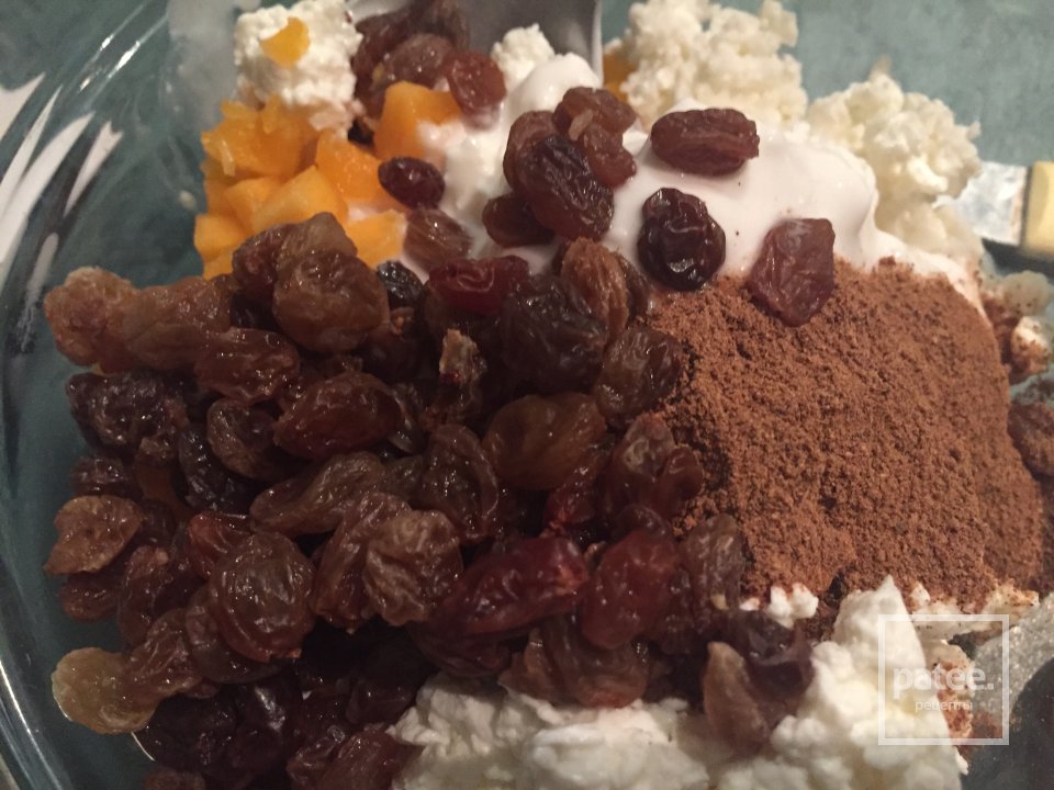 Тыкву промыть и разрезать вдоль, очистить середину. Оставшуюся мякоть мелко порезать, смешать с творогом, заранее замоченным изюмом и специями по вкусу (корица, имбирь, мускатный орех, гвоздика, перец чёрный).