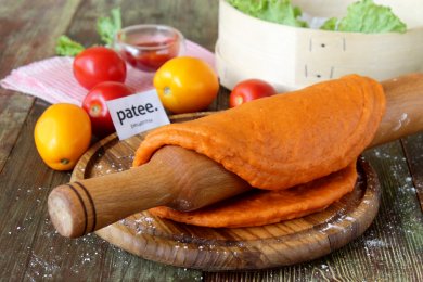Томатное тесто с яркой окраской и слоистой текстурой подходит для несладкой выпечки: пиццы, пирожков, рогаликов, больших пирогов с начинкой.