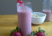 Легкий и полезный напиток из молотый овсяных хлопьев с клубникой, молоком и кленовым сиропом.