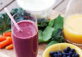 Вкусный освежающий напиток, полный витаминов - из моркови с красной капустой, кале, шпинатом, ежевикой, клубникой, апельсиновым соком, йогуртом и миндальным молоком.