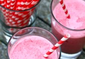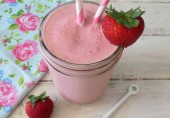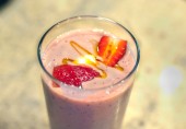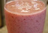 Густой кремообразный смузи из арахисового масла со свежей клубникой, нежирным йогуртом и молоком.