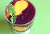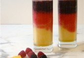 Вкусный, полезный, красочный фруктово-ягодный напиток из двух смесей - клубники с черникой и гранатовым соком и манго с апельсиновым соком.