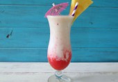 Сладкий освежающий тропический напиток из замороженных банана, ананаса и кокосового молока, с потоком лавы из клубничного сока.