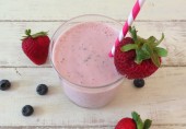 Освежающий напиток из овсяных хлопьев с клубникой, черникой, йогуртом, молоком и семенами чиа.