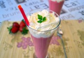 Вкуснейший освежающий напиток - смузи из свежей клубники с молоком и сахаром, украшенный взбитыми сливками.