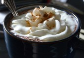 Вкуснейший молочный напиток с шоколадом, корицей, миндальным экстрактом и кайенским перцем, украшенный взбитыми сливками и корицей.