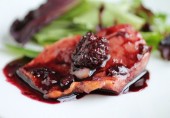 Филе лосося, приготовленное в соусе из ежевичного джема с чесноком, красным вином и свежей ежевикой. По мере готовки соус загустеет и превратится в глазурь, которой можно будет полить или смазать рыбу непосредственно перед подачей.
