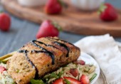 Филе лосося в панировке из измельченных фисташек с сухарями, приготовленное на оливковом масле, с салатом из шпината с огурцом, клубникой и пастой орзо, политое сладкой бальзамической глазурью.