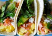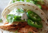 Кукурузные или пшеничные лепешки с филе лосося, натертым смесью специй и жаренным на оливковом масле, и кремом из сметаны с перцем халапеньо, соком лайма и кинзой.