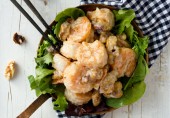 Китайское блюдо - креветки, покрытые яичным белком и кукурузным крахмалом и жаренные на растительном масле, в соусе из меда с майонезом и лимонным соком, с грецкими орехами, слегка отваренными в сладком сиропе.