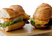 Бутерброды с филе тилапии, покрытым мукой, взбитым яйцом и сухарями с сыром и специями и запеченным в духовке, и чесночным майонезом.