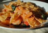Паста с креветками и шпинатом, приготовленными в винном соусе с помидорами, луком, чесноком и пармезаном.