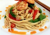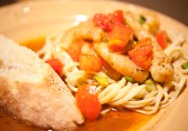 Креветки, маринованные в пряном соусе с белым вином, обжаренные на сковороде и смешанные со спагетти.