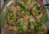 Мидии, сваренные с солью, перцем и павровым листом, залитые сырным соусом с зеленью и чесноком и запеченные в духовке.