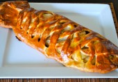 Пирог из дрожжевого теста с тушкой рыбы внутри. Для пирога подойдет малокостная рыба, как сиг или треска.