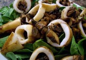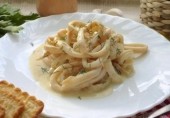 Кольца кальмаров, тушенные с луком в сметанном соусе.