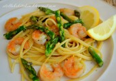Свежая спаржа с креветками, обжаренными в масле, паста и лимонные ломтики.