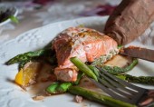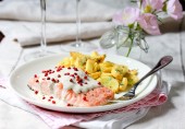 Вкусные и быстрые в приготовление стейки из лосося под соусом из розового перца.