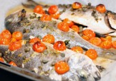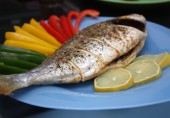 Дорада фаршированная перцем получается очень нежной, тающей во рту. К такому блюду грех не купить бутылочку сухого белого вина.