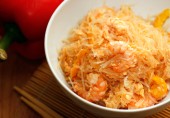Для приготовления Фунчозы с креветками лучше заранее нарезать овощи и почистить креветки, потому что дальше все будет происходить очень быстро.