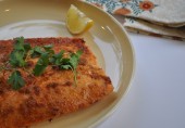 Филе камбалы, посыпанное сухарями со специями и запеченное в духовке. Подавайте со смесью масла с паприкой и кинзой.