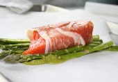 Филе лосося, смазанное горчицей и запеченное в духовке, разделенное на кусочки и еще раз запеченное со свежей зеленью, сладким перцем, сливками и пахтой.