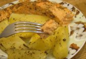 Ингредиенты:2-3 средние картофелины;125-250 грамм лосося;2-4 ломтика лимона;растительное или сливочное масло по желанию;соль;специи.