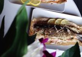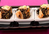 Для любителей японской кухни, я предлагаю попробовать “жемчужину” с острова Хоккайдо, это теплый нежный лосось в семенами кунжута.