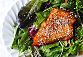 Филе лосося, маринованное в соевом соусе с кунжутным маслом, апельсиновым соком и цедрой и запеченное в духовке, и салатная зелень с морковью и красной капустой.