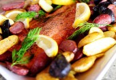 Филе лосося, смазанное горчицей и запеченное в духовке, разделенное на кусочки и еще раз запеченное со свежей зеленью, сладким перцем, сливками и пахтой.