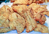 Филе тилапии, маринованное в лимонном соке с кокосовым молоком и покрытое кокосовой стружкой с миндальной мукой и специями.