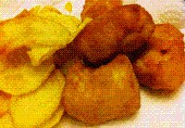 Филе рыбы (палтуса или трески), покрытое мучной смесью с солью и разрыхлителем и обжаренное в масле, и хрустящие картофельные чипсы.