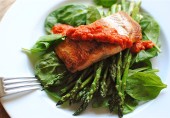 Лосось, обжаренный в масле, спаржа и песто из запеченного перца с миндалем, чесноком и томатной пастой.