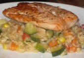 Филе лосося, пожаренное на гриле или скороводе, и ризотто с кабачками, помидорами, кукурузой, морковью, зеленью и специями.