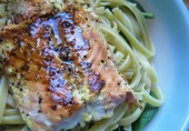 Жареное филе лосося с пастой и свежим шпинатом, политые цитрусовым соусом.