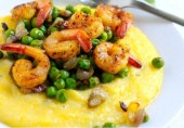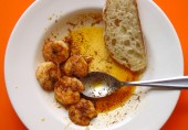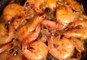 Креветки, покрытые специями, жаренные на сковороде и политые соусом из лимонного сока с белым вином.