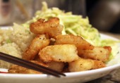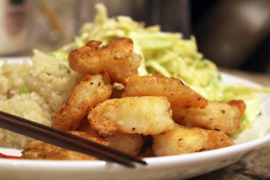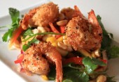 Креветки, обжаренные в панировке из миндальной муки, и салат из огурцов с красным перцем, манго, луком и кинзой, политый острым соусом.