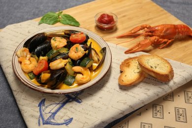 Жаркое «По-средиземноморски» - рецепт от шеф-повара телепроекта “Сделано со вкусом” на ТНТ Сергея Леонова и ведущей Елены Усановой для любителей морепродуктов.