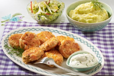 Рыбные фрикадельки можно подать с картофельным пюре или салатом.