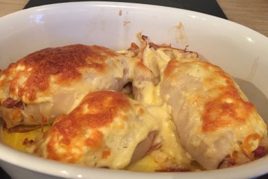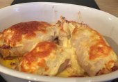 Фаршированный кальмар свиным фаршем, запечный под сыром в сметанном соусе.