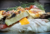 Филе трески с овощами, под сметано-горчичным соусом и сыром.