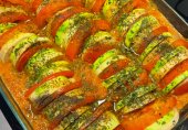 Веер из баклажанов с помидорами и сыром, приготовленный в духовке, получается необычайно красивым, вкусным и достаточно сытным.