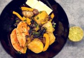 Тут конечно все просто, ингредиенты можно брать на глаз.К гарниру можно пожарить курочку в сметане)