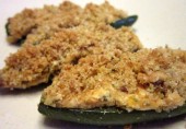 Пряные острые халапеньо с начинкой из сыра и бекона, посыпанные сухарями и запеченные в духовке.