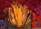 Сладкий картофель, замоченный на пару часов в холодной воде, приправленный солью и покрытый оливковым маслом и запеченный в духовке.