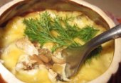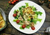 М’ясо з грибами і сиром запечене у вершковому соусі. Якщо готувати на вечерю, то подаємо з салатом зі свіжої зелені, а на обід з рисом, картоплею або пастою.
